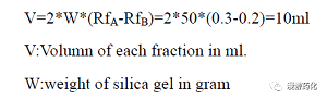 7,在 Run Column 時所收集的分離份(fraction)體積(毫升)通常為硅膠克數的1/4 以下。實際情況可用下列公式來求出約略值,如欲分離成分A 與B,而A 之Rf 值為0.3,B 之Rf 值為0.2 則最適合之分離份(fraction)體積為:設硅膠量為50g